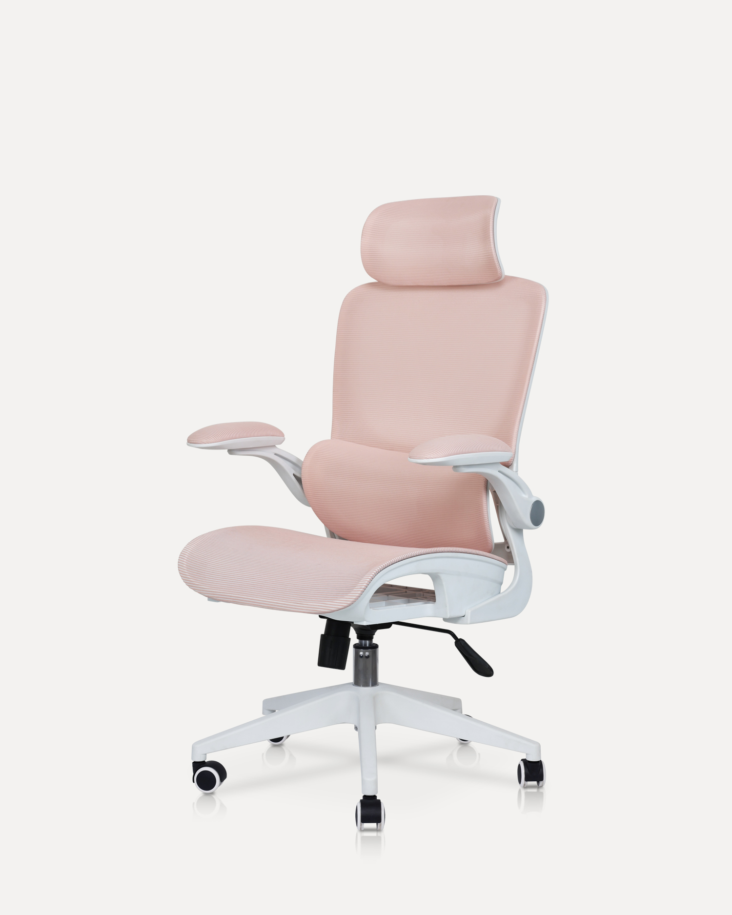 - This stylish office chair is a perfect blend of comfort and elegance. Featuring a soft, pastel pink fabric, it brings a fresh and inviting look to any modern workspace. The ergonomic design includes a high backrest and a well-padded headrest, providing optimal support for your neck and spine, promoting proper posture for extended hours of work or study. The breathable fabric ensures that you remain cool and comfortable throughout the day.